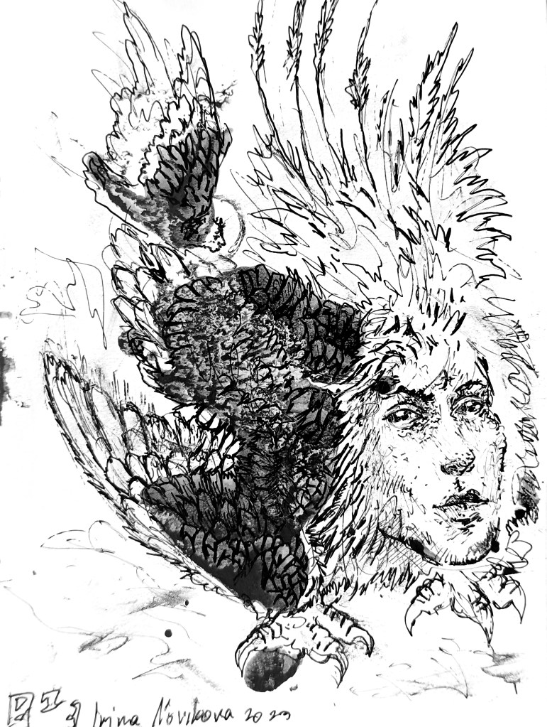 She opened her eyes, got up on the bed, leaned on her sharp elbows, it seemed that she was sick, it seemed that something was flying over her, rushing and dying, becoming herself … She looked at the walls, they were the same grey and old, wallpaper faded a little on the sunny side, she raised her hand to the light, looked at her skin, there were a few greyish feathers on it, they were very tiny breaking through the pink thin skin. Nothing surprised her anymore…. Nothing…