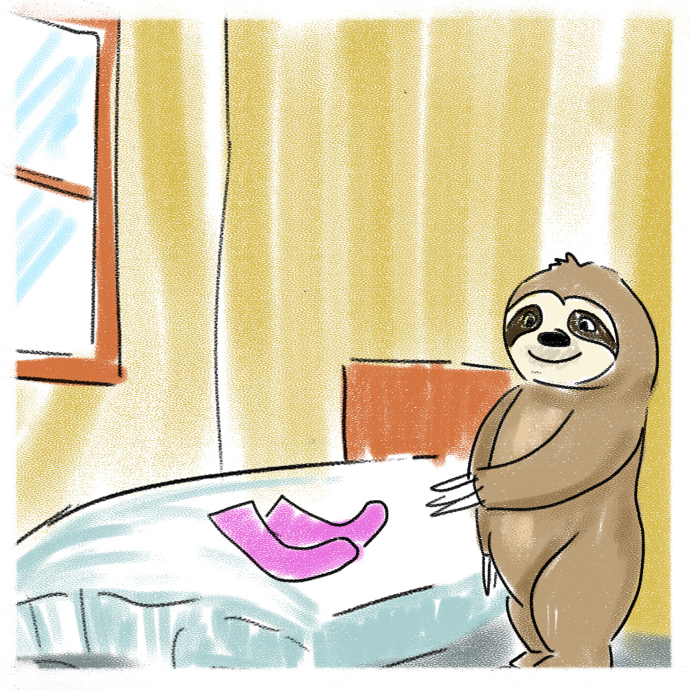 Then she was sad and she ran to her mom. Her mom asked her, “what happened?” and Kania said a wolf ate the socks. Kania said she feels so so sad because she loved her special socks that her best friend Cantcha gave her. Then Kania said to her mom, “I am so slow. I couldn’t catch the socks.” Her mom said, “I am going to give you a sloth hug! We are supposed to be slow.”