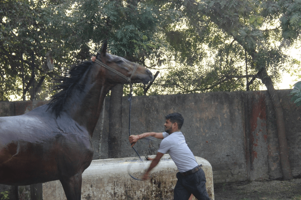 Caretaker bathing a horse, their movements deliberate and intimate. This simple act of care blurs the boundary between freedom and dependence, revealing a relationship built on mutual need and understanding. Beneath the flowing water, the horse’s gleaming coat reflects its strength, while its lowered head suggests a quiet acceptance of captivity.