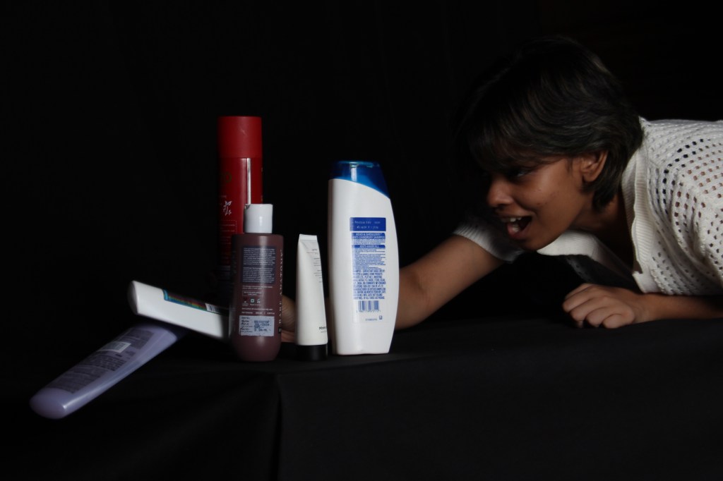 The subject is shown to have accumulated all the goods and attempts to use everything at once.