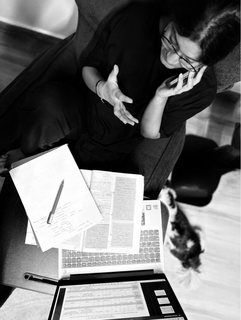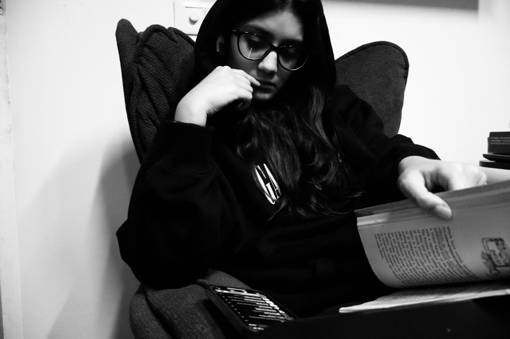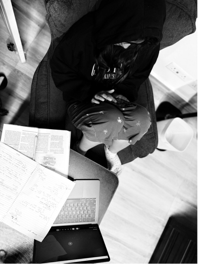 The books are present, the work is waiting, yet the habit of turning toward the phone lingers in the background—almost automatic, almost unnoticed. In this moment, the divide between intention and impulse becomes subtly visible. The shadow shows where her attention leans before her body does, hinting at how easily focus can shift. Even without movement, the pull of the screen is already shaping the moment.