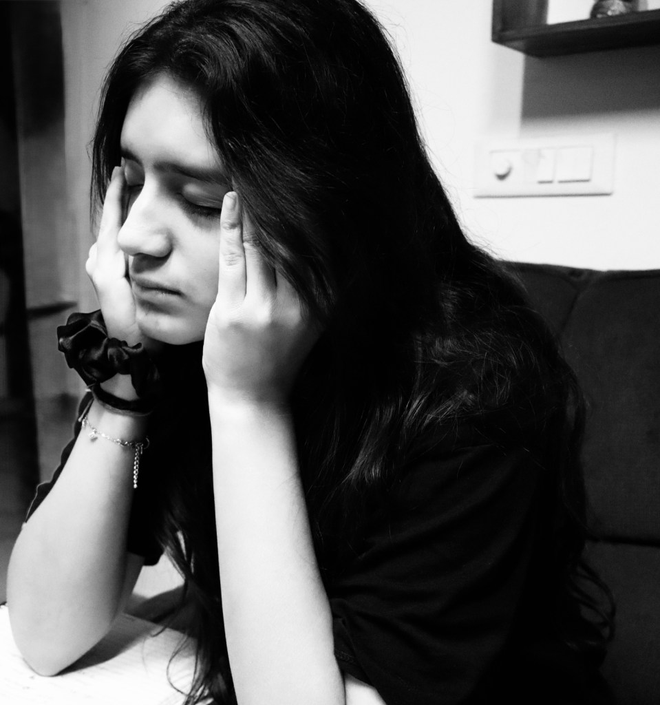 Her hands press gently against her face, the exhaustion finally catching up. She isn’t frustrated with the material, but with the weight of constantly beginning and rarely feeling progress. It’s an honest moment of overwhelm—one that students rarely admit but often experience. In this pause, she isn’t battling the books but the quiet fatigue built from days of trying. It’s the kind of tiredness that settles before she even realises it, reminding us how heavy the smallest tasks can feel when the mind is already running low.