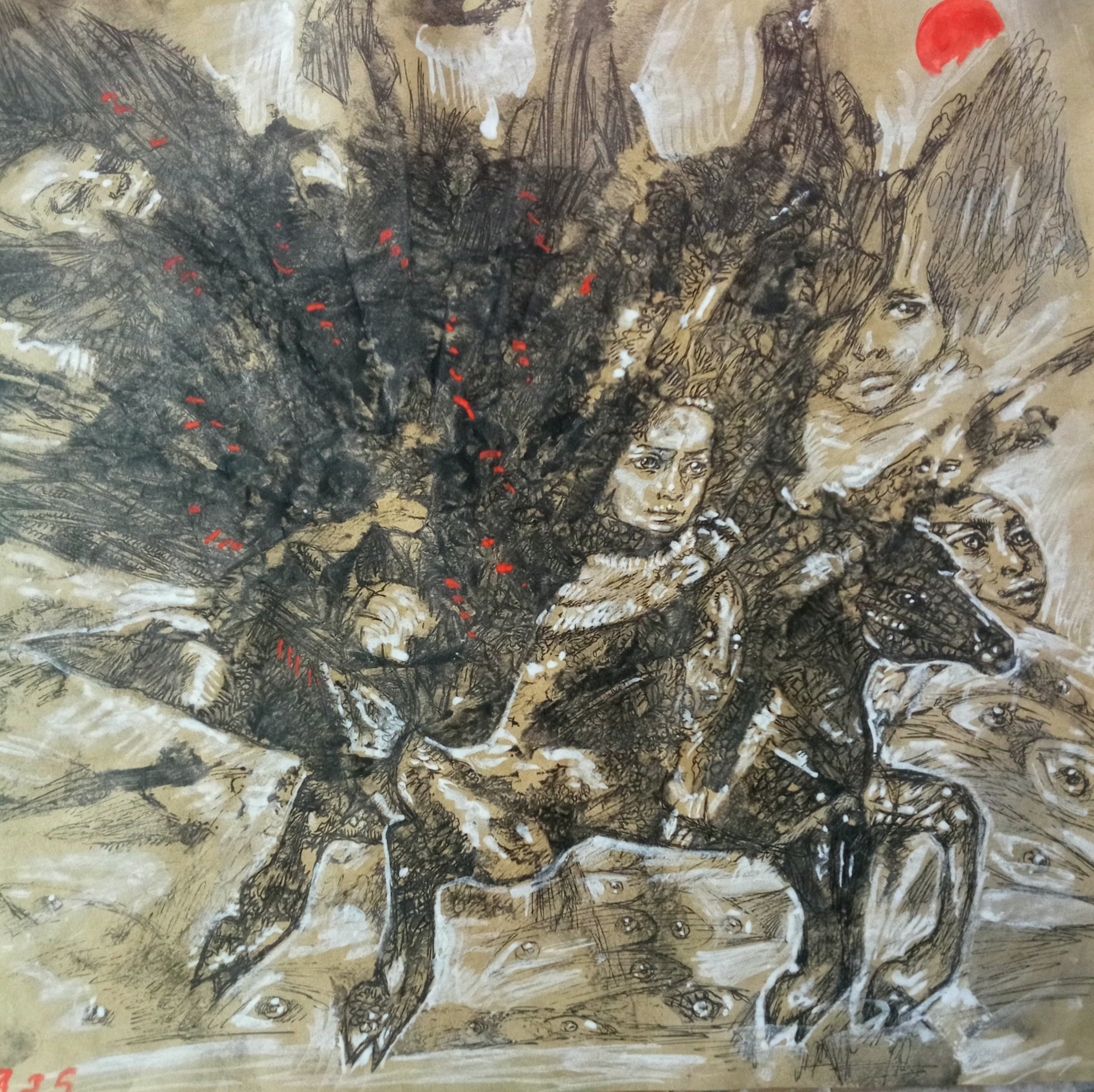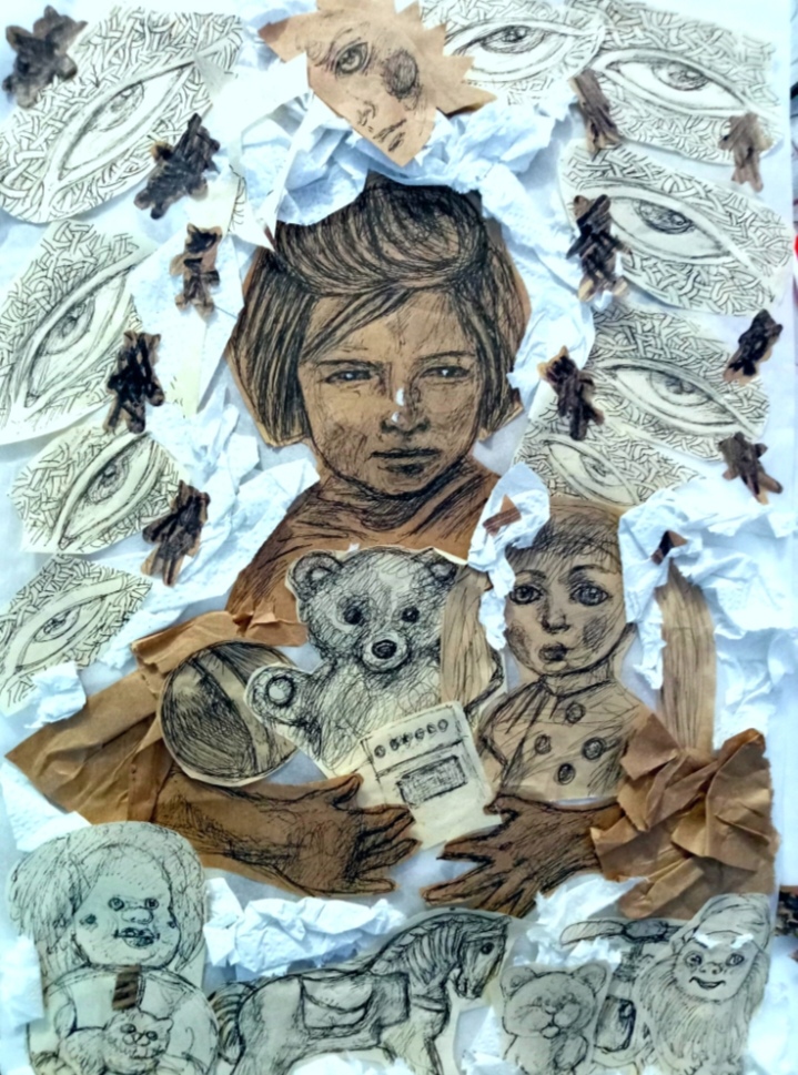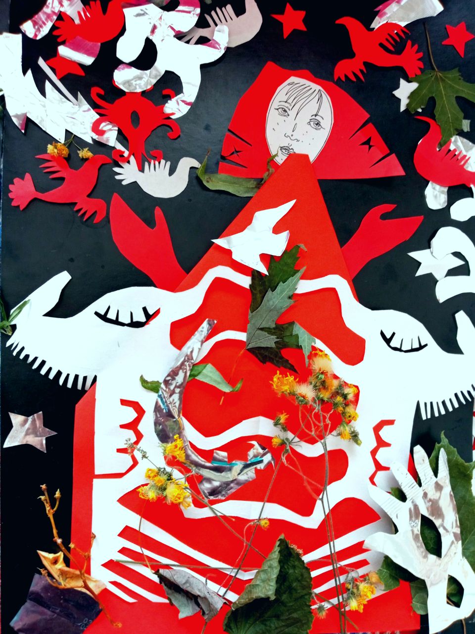 Editor’s Note: These works unfold like fragments of a shared dreamscape—where red pulses as memory, alarm, and desire against fields of black and white silence. Paper-cut animals and birds hover between innocence and omen, while human faces emerge and dissolve, scarred by gesture and shadow. Organic elements—leaves, flowers, torn foil—anchor the compositions in the physical world, even as the figures drift toward myth. Together, the artworks speak of vulnerability and resilience, of bodies and spirits caught between flight and fracture, suggesting a quiet struggle to remain visible, alive, and whole within chaos.