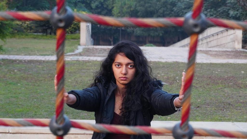 She stands in the middle of all this, wedged between the trees, staring straight into the camera with a flat expression. No mask yet, no performance, just a face that has run out of reactions. This image sets up the central idea of the essay: before we even choose who, we want to be, we are already surrounded by opinions about who we should be.
