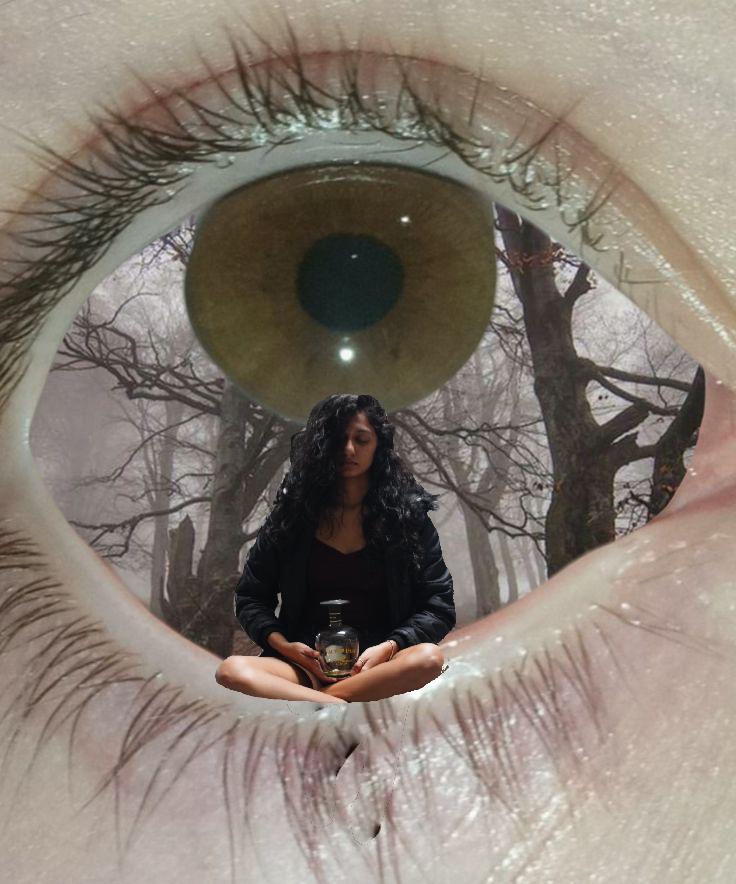 In this image the subject is no longer surrounded by gazes; she is sitting inside one. The eye becomes a kind of chamber, lined with lashes and backed by a fading forest. Is being held in someone’s gaze, or even in one’s own a form of safety, or another way of being trapped? The trees behind the iris look worn and brittle, like old beliefs and judgements that the gaze still carries as unquestioned truth. She sits cross-legged with her eyes closed, holding a bottle carefully in her lap. The bottle stands in for coping – the private rituals and substances people turn to when the outside world becomes too sharp. The gaze is no longer only something that comes from outside. It has become a space she occupies, and a way she has started to watch and manage herself.