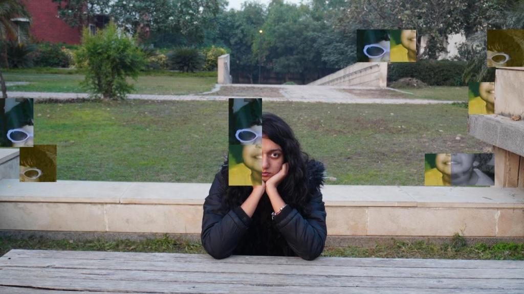 Here the park is quiet and open, but the frame is crowded in a different way. Small squares of an old photograph drift across the scene: a wide smile, a yellow shirt, a purple sunglass. One of those fragments sits directly over half the subject’s face, so that the child and the present-day version share the same head for a moment. Were the fragments of my earlier self any truer? The times I didn’t realise I was wearing a mask? The times I smiled from jaw to jaw knowing no trouble? The time I wore a purple sunglass and a bright yellow top? The scattered tiles behave like memories that keep popping up uninvited, insisting that there was once a simpler, truer person to go back to. The past becomes another mask to negotiate – one more face that does not fully match the one she is wearing now.