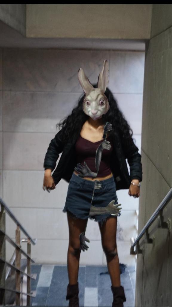 In this frame the subject walks up a stairwell wearing a rabbit mask, while a thin column of disembodied hands climbs her. The human face has been fully replaced with only the mask looking out. The hands don’t belong to any visible person, which makes them feel like instructions or habits that have been absorbed so deeply they no longer need a speaker. The scene is not about someone literally shouting orders from outside. What thoughts, judgments and rules are moving this body that did not begin with her? Family, culture, gender, social media – once their voices have been repeated enough, they start to act like invisible strings. What do I hold in my mind that isn’t my own?
