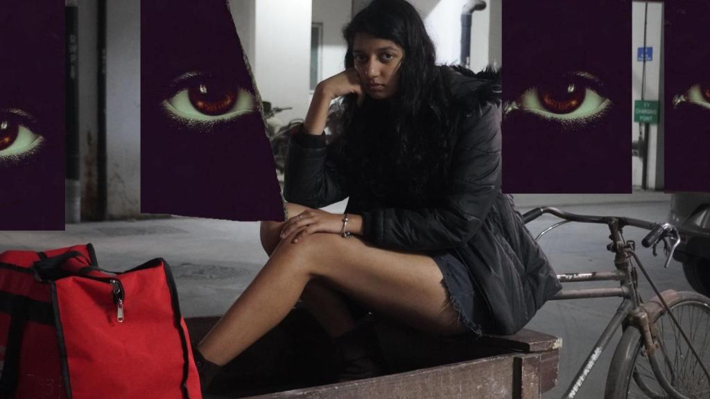 The subject is perched on a cart with a travel bag at her side, as if between places, not quite arriving or leaving. Around her, flat panels with a single eye hang in the air. They cut across the pillars and background and stand in for all the outside watching that has followed her through the earlier images. The centre panel is placed so that it drops exactly between her hands, which are resting on her knee and form a loose V around it. The eye is no longer just out there; it is now sitting in the space she holds in front of herself. The external gaze and her own body literally meet in the middle. She combines her gaze with the eye’s. Is the only way to escape to become a watcher? The question underneath the picture is simple: when someone is watched long enough, do they start carrying the watcher inside them? In the flow of the essay, this image shows the point where the boundary between “they are looking at me” and “I am looking at myself the way they do” starts to disappear.
