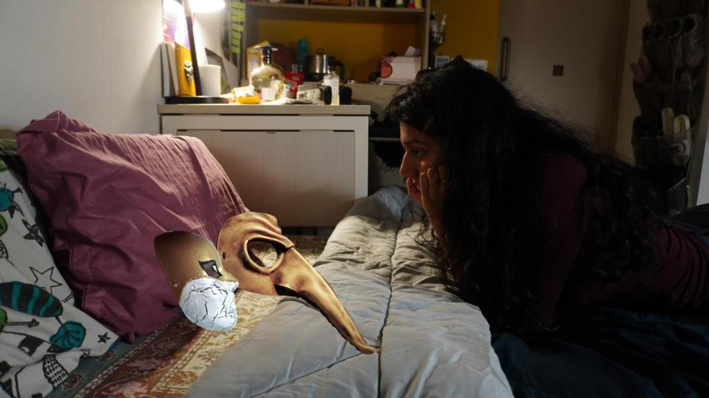 Back in the hostel room, everything is familiar: the lamp, the cluttered shelf, the unmade bed. The only strange thing is what’s lying on the pillow opposite the girl – two masks facing her. One is cracked and heavy, the other long-beaked and sharp. She isn’t wearing either; she just lies there, chin in hand, staring at them. They’ve been put down, almost politely, so she can look at them properly. Which one fits the next situation? Which one will match the direction of all those earlier gazes – the fish eyes that never agreed on where she should look? Left, or right? Where are the eyes of the fishes pointing to? The quiet habit of planning how to appear before stepping out of a room. It suggests that after enough outside control, some of the work of managing identity is simply done alone, on the bed, in negotiation with the masks we keep ready at arm’s length.