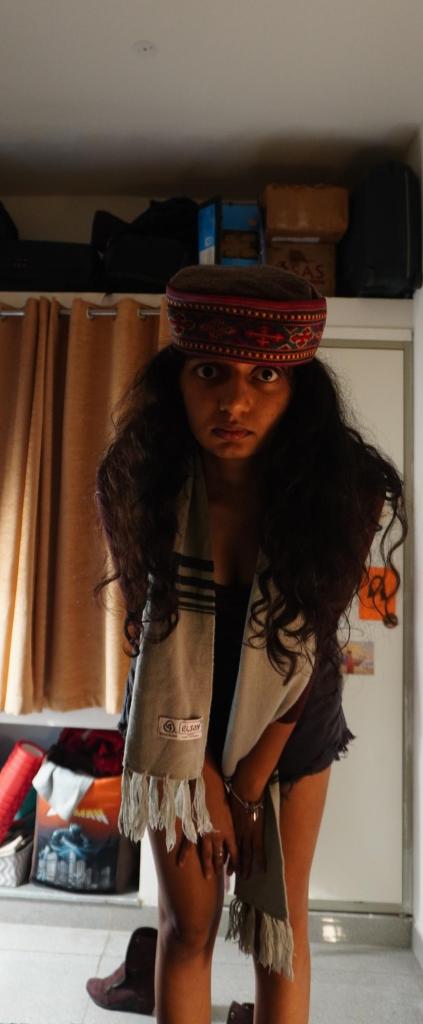 She stands bent slightly forward, looking straight into the camera, wearing a traditional cap and a long scarf. Above her head, on the loft, are stacked suitcases and boxes. Together they form a visual of all the baggage being literally on top of her. She’s alone but she carries the baggage on the head. The cap is the main “mask” here. It signals a cultural identity that is often worn with pride but can also feel like weight – a reminder to behave a certain way, represent a community correctly, live up to stories attached to that cloth. The scarf draped down her shoulders turns that identity into a kind of uniform. The expression on her face keeps the question open – is this a comfortable fit, or just another version she has learnt to balance on her head?