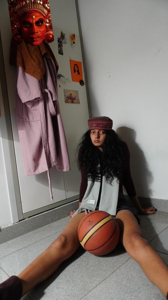 The subject sits on the floor, cap and scarf still on, legs stretched out, a basketball resting between them. On the cupboard door above her hangs a bright ritual mask – a kind of god-face borrowed from performance and worship. It hovers over her like a supervisor. The stakes feel different. The guilt of being watched. The cap and scarf say she is doing her part, carrying the identity she has been handed. The mask on the door becomes the god of culture, checking quietly whether she is keeping to the path laid out by ancestors. “Don’t anger the gods” or “This isn’t our culture” is often just another way of saying “don’t step out of line”. The ball, sitting right at the centre of her body, stands for her own wants and interests. To pick up the ball and move freely, does she first have to take off the cap – or can she hold both without apology?