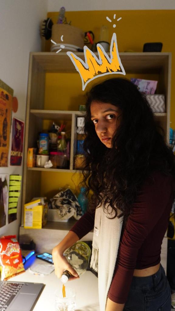 The subject’s expression cuts against that. She is not celebrating; she just wanted that drink in that instant. The picture asks what happens to identity if every small choice is treated as permanent proof of character. If she drinks something else tomorrow, does that cancel the crown or simply replace it with another one? The fear of being fixed, constant and predictable hangs over her like a reward she never really asked for.
