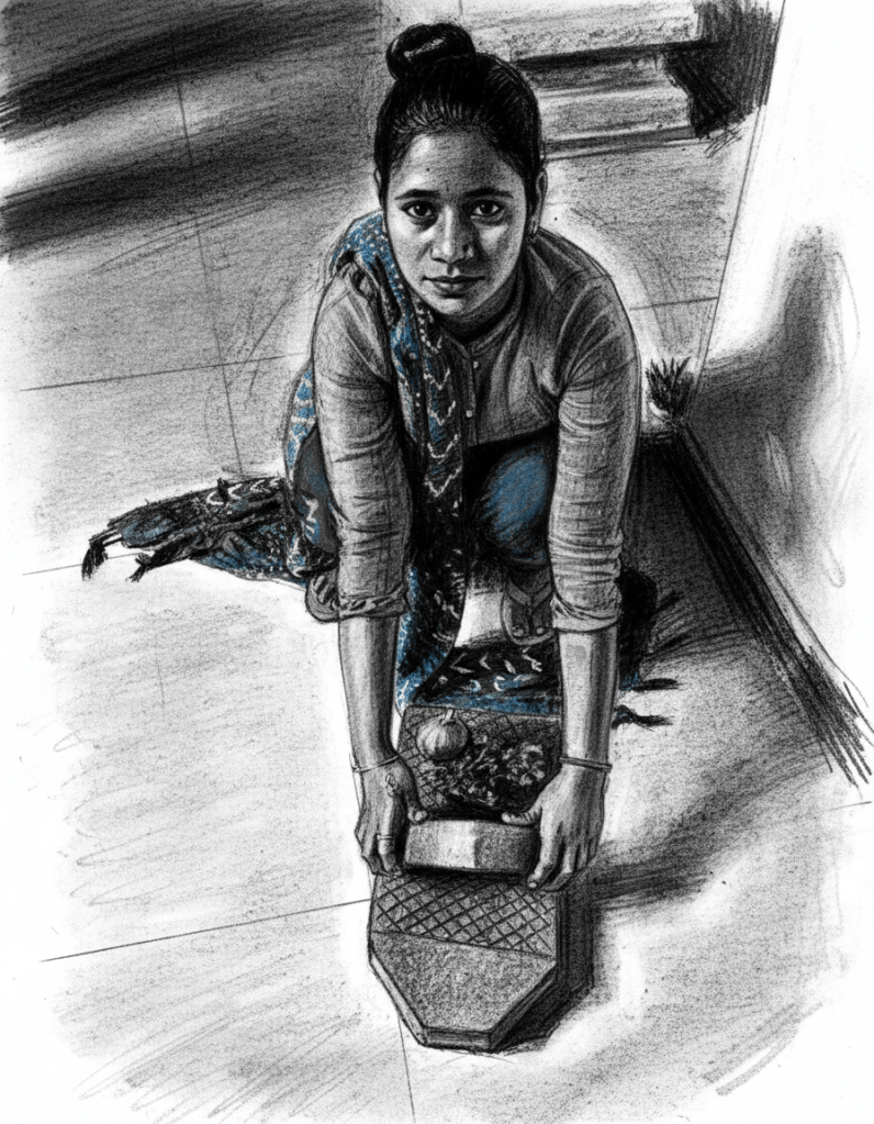 Nilam Devi crouches on her haunches on the mud floor of her kitchen, her bright blue polyester sari bunched between her sweaty thighs, and the skin between her blouse and her sari's waistband beaded with sweat. The red glass bangles on her wrists clink, chaan-chaan, as her hands, holding the batta—a cylindrical hand-held roller made of basalt—move with the quiet authority of grr-grr sounds over the flat stone of her sil. Her gestures are steady and deliberate, creating a slow rhythm of repetition and memory, chaan-chaan, grr-grr, a duet between hand and stone, an act perfected by generations of women before her.