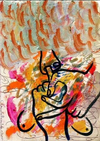 Editor’s Note: This body of work inhabits a restless, almost feverish visual language where figures dissolve, collide, and reassemble within layers of colour, line, and instinct. The artist moves freely between figuration and abstraction, creating distorted bodies and fragmented faces that seem to carry emotional residue rather than fixed identity. There is a raw immediacy to the mark-making—scribbles, scratches, and bold contours—that resists polish in favour of urgency. At times playful, at times unsettling, these works echo traditions of outsider art and neo-expressionism, where the subconscious spills directly onto the surface. Beneath the apparent chaos lies a deeply human terrain—of vulnerability, desire, memory, and dislocation—rendered through a visual vocabulary that is both childlike and profoundly complex.