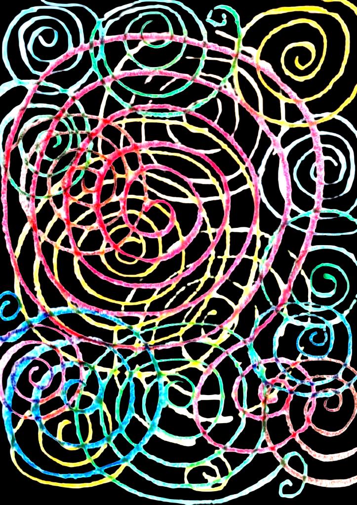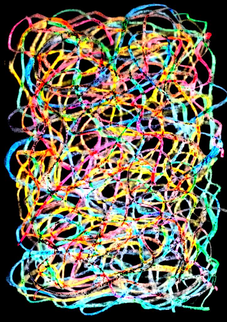 Artist’s Note: The artist sought to experiment with abstract painting without a fixed pattern, moving away from her usual style of drawing. When she picked up paper and oil pastels, she allowed her hand to move instinctively, without a predetermined idea of what she intended to create. From this process emerged compositions of large and small vortices, intersecting and layered with varied colours, symbolising the whirlwind of thoughts, nightmares, and dreams within the human mind. The work embraces confusion, disorder, and randomness—mirroring the absence of clear patterns in human consciousness. The winding, interlacing lines of different colours spread across the surface evoke both physical and mental journeys, suggesting paths shaped by chance rather than certainty.