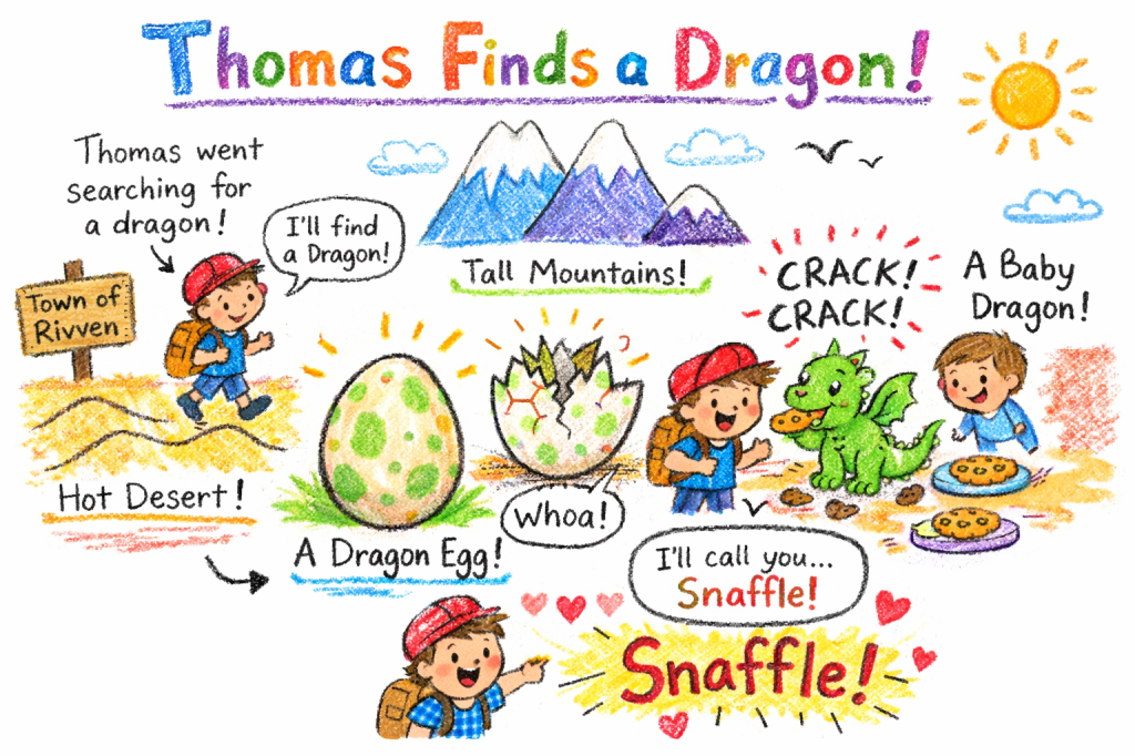 Thomas did not know what to do. The dragon wolfed up the cookies. Then Thomas had the perfect name. Snaffle!